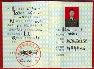 原陆军某部军士,预备役上士,大专文化,参加过高海拨陆空对抗演习,多次参与实兵演练,曾参加维稳行动,并被上级表彰,多次被评为优秀班长,优秀带兵骨干,优秀士兵。